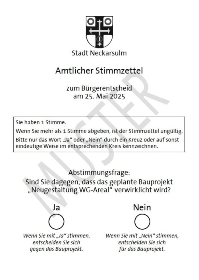 Der Bürgerentscheid ist ein Instrument der direkten Demokratie in Deutschland auf kommunaler Ebene. Mit ihm können die Bürger in einer Gemeinde über Fragen des eigenen Wirkungskreises entscheiden. Der Neckarsulmer Gemeinderat hat am 20. Februar 2025 beschlossen, in einem Bürgerentscheid die Bürger über das Projekt „Neugestaltung des WG-Areal/Schlossplatzes“ entscheiden zu lassen.
