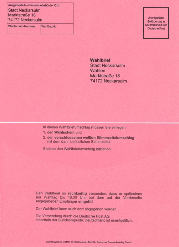 Für die Teilnahme an der Wahl per Briefwahl aus dem Ausland beachten Sie, dass der Wahlbrief ausreichend frankiert wird. Leider können wir auch hier voraussichtlich ab dem 7. Februar mit dem Versand der Briefwahlunterlagen beginnen. Dennoch bitten wir Sie Ihren zugestellten Wahlunterlagen schnellstmöglich zurückzusendet, damit diese spätestens am Wahlsonntag bis 18:00 Uhr bei der Stadt Neckarsulm, Rathaus, Marktstraße 18, 74172 Neckarsulm vorliegen. Wir empfehlen, Wahlbriefe aus dem Ausland per Luftpost zu versenden. Dazu benötigt man einen Luftpostaufkleber (Priority/Prioritaire), den man unter anderem im Internet findet.