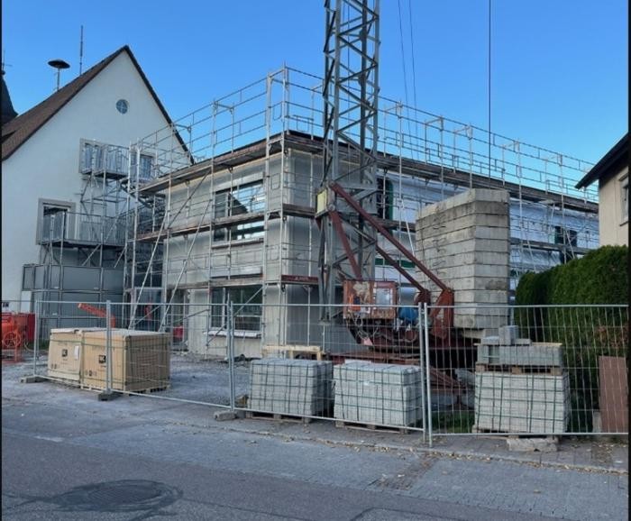 Der nächste Meilenstein folgte am 11.09.2025, als der Anbau an nur einem einzigen Tag nahezu vollständig errichtet wurde. Bei der Errichtung des Anbaus hat man sich für eine sogenannte Modulbauweise entschieden: Insgesamt acht Module aus Holz wurden durch die Baufirma vorab gefertigt, um anschließend auf der Bodenplatte in Obereisesheim zu einem Gebäude zusammengesetzt zu werden. Im Zeitraum zwischen dem 16.09.2025 bis 20.09.2025 wurden weitere Fertigbauteile aus Beton, wie beispielsweise die Wände für den Eingangsbereich und die Treppe angeliefert.