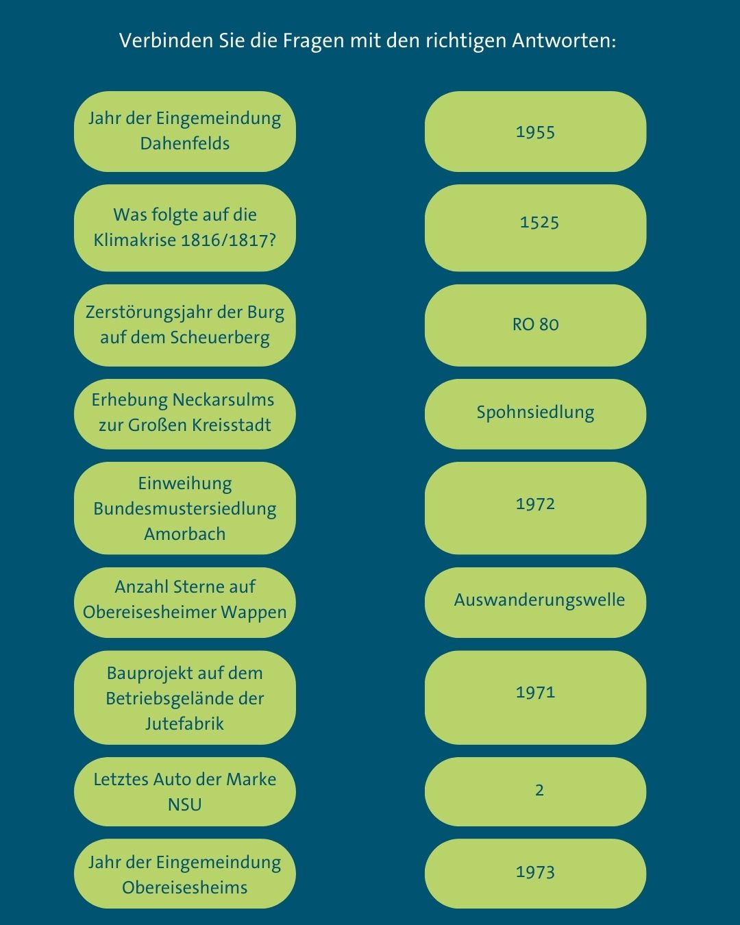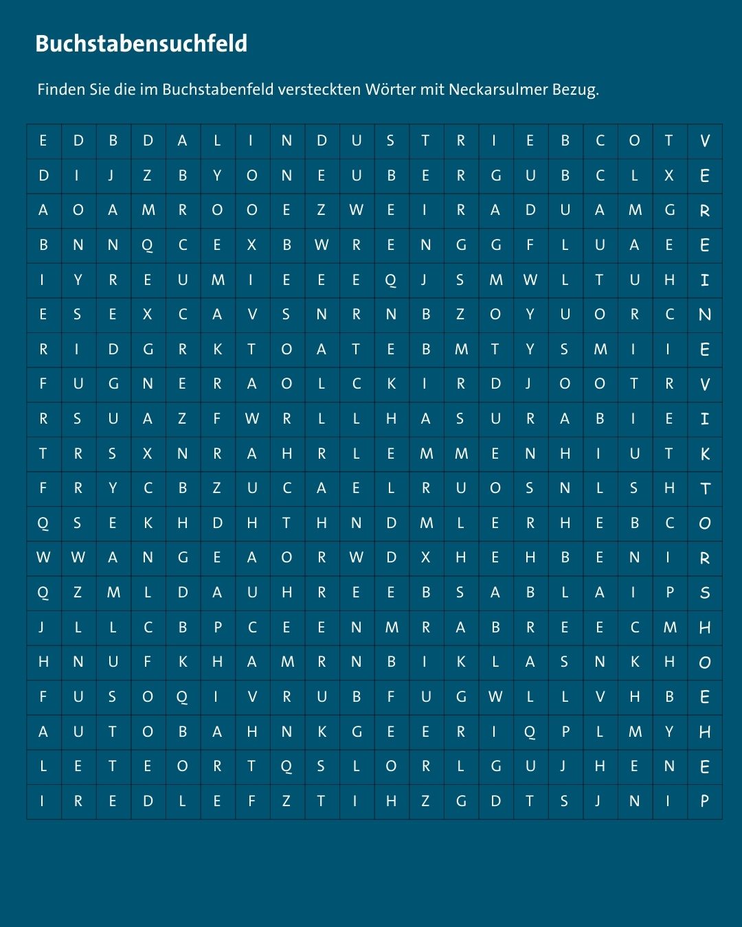Die Rätsel - ein Kreuzworträtsel, ein Buchstabensuchfeld und ein Zuordnungsspiel - werden in der Ausgabe Nr. 10 des "Neckarsulm Journal" abgedruckt. Die Lösungen der Rätsel werden in der folgenden Ausgabe des Neckarsulm Journal veröffentlicht.