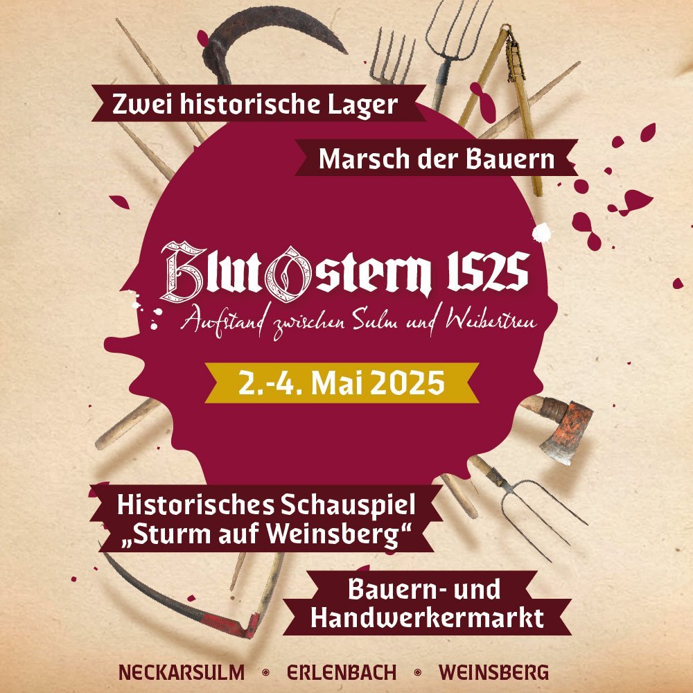 Das Gedenkwochenende (01.-04. Mai 2025) an den Bauernkrieg war ein interkommunales Projekt der Stadt Neckarsulm, der Stadt Weinsberg und der Gemeinde Erlenbach.