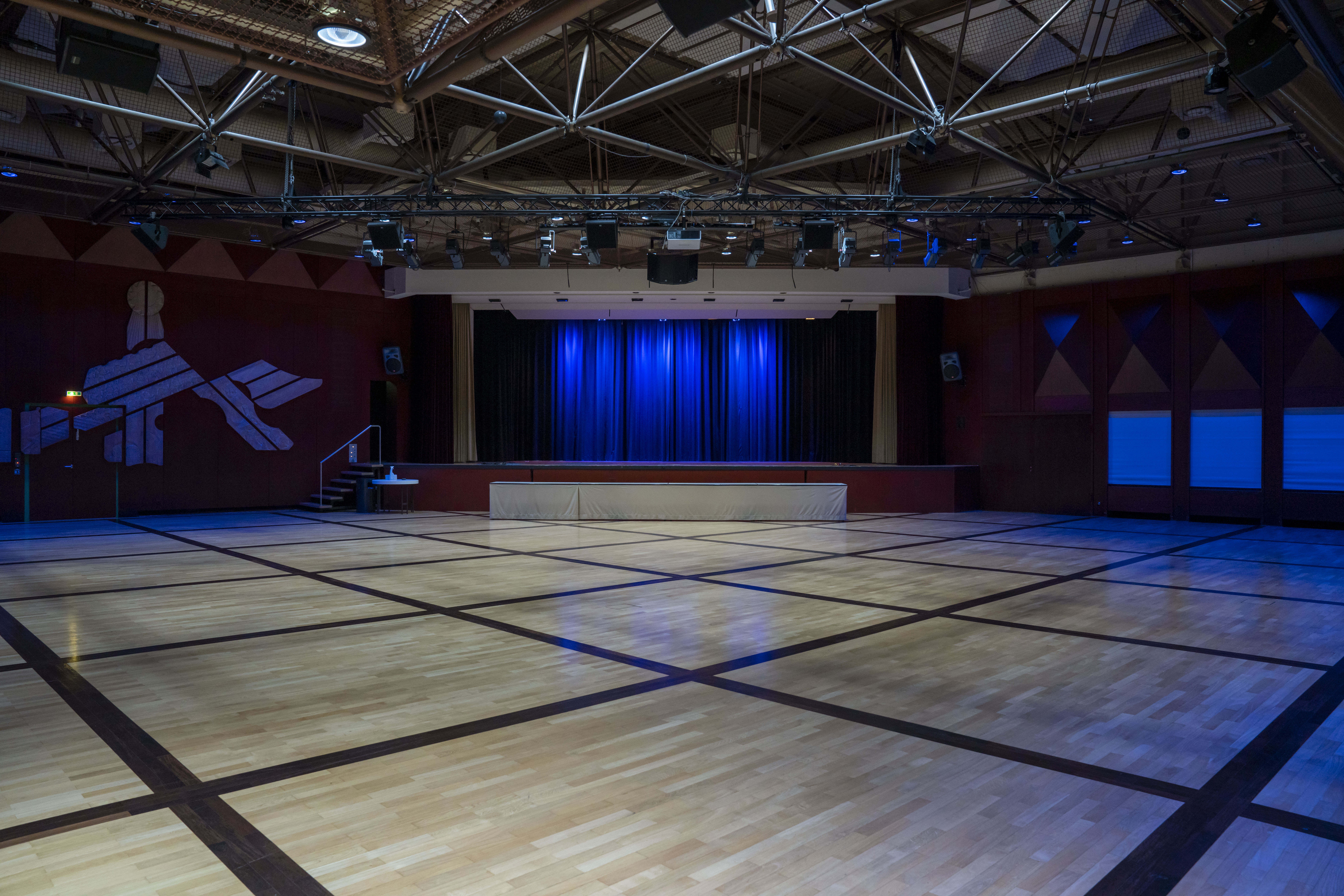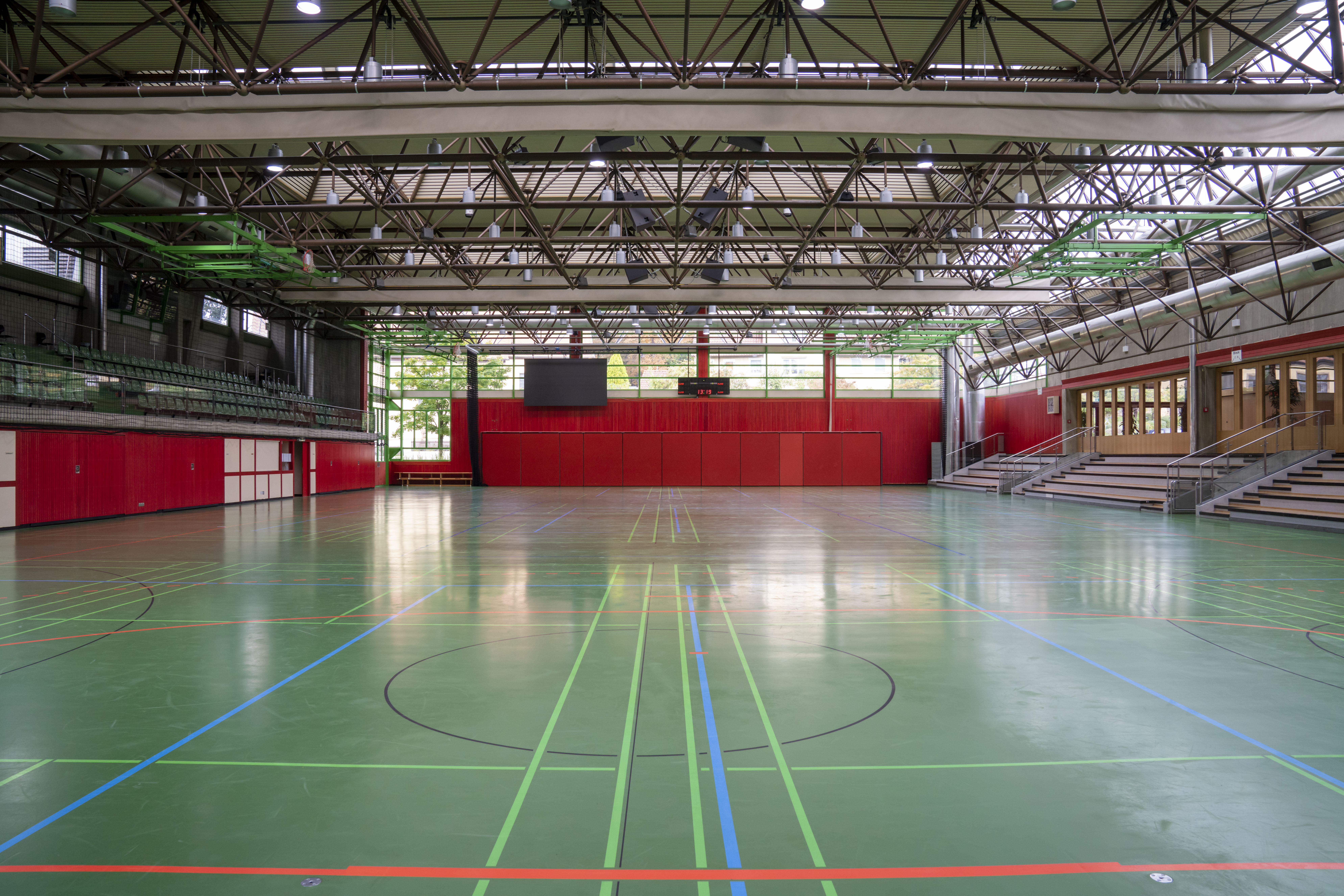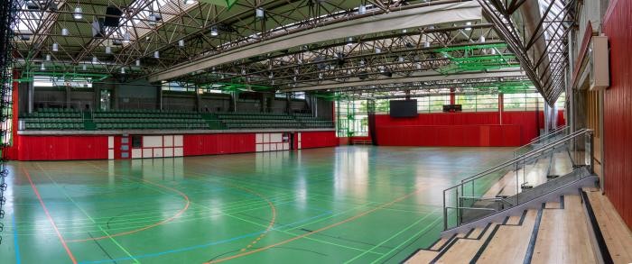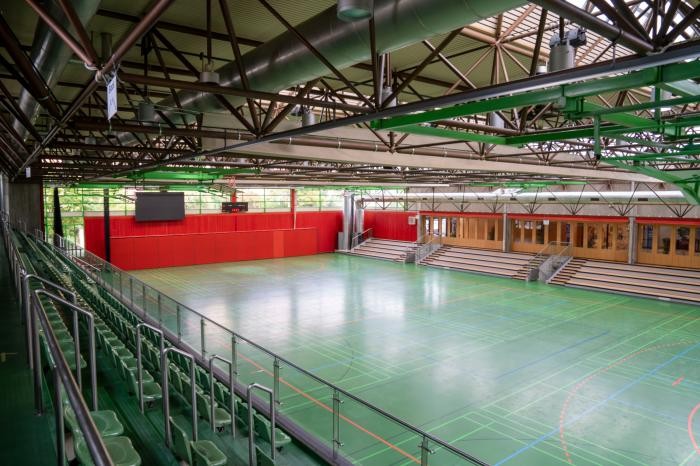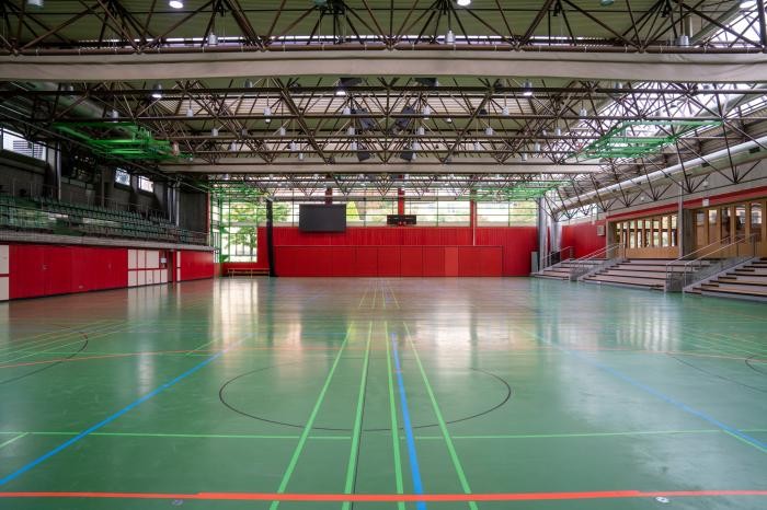 Sie verfügt über eine dreiteilige Sporthalle mit 2 Tribünen für insgesamt 800 Besucher (Maße 50 Meter auf 31,75 Meter). Der 558 m² große Kultursaal bietet Platz für: 1000 Personen ohne Bestuhlung