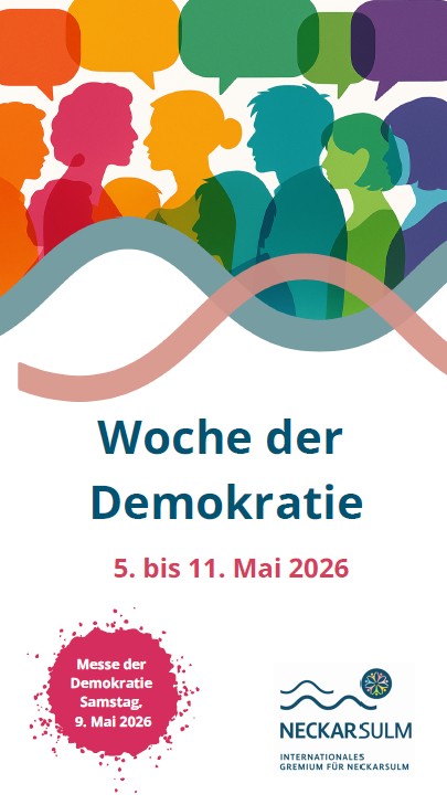 Woche der Demokratie vom 5.-11. Mai 2026 in Neckarsulm Im Mai 2026 findet in Neckarsulm die Woche der Demokratie statt. Den Flyer finden Sie hier: Woche der Demokratie Flyer Online (8,3 MB)