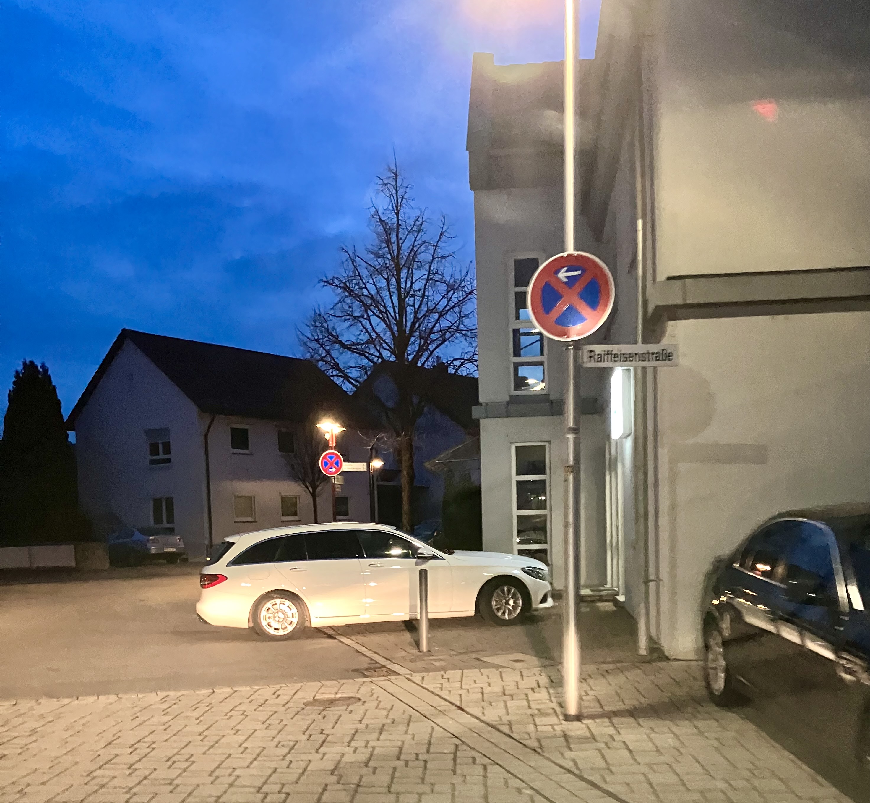 Direkt vor der Bankautomatenfiliale platziert die moderne Verkehrsteilnehmerin ihren hochpreisigen, weißen AUDI so, dass er von allen Seiten ins richtige (Straßenlampen)Licht gerückt wird. Prädestiniert für Veröffentlichungen in TikTok, Facebook, Instagram und in den "Obereisesheimer Mitteilungen". Prima geeignet sind die Aufnahmen auch für die Bußgeldstelle der Stadt Neckarsulm und die Führerscheinstelle im Landratsamt Heilbronn. Dort werden die Aufnahmen ausgewertet. Besonders hochpreisig versteht sich. Dafür sorgt die vorsätzliche Behinderung der Fußgänger und des Buslinienverkehrs unter absichtlicher Missachtung einer absoluten Halteverbotsregelung. Die hohe Beanspruchung von (Verbots)Paragraphen zieht eine entsprechend hohe Parkgebühr von 50 € aufwärts nach sich