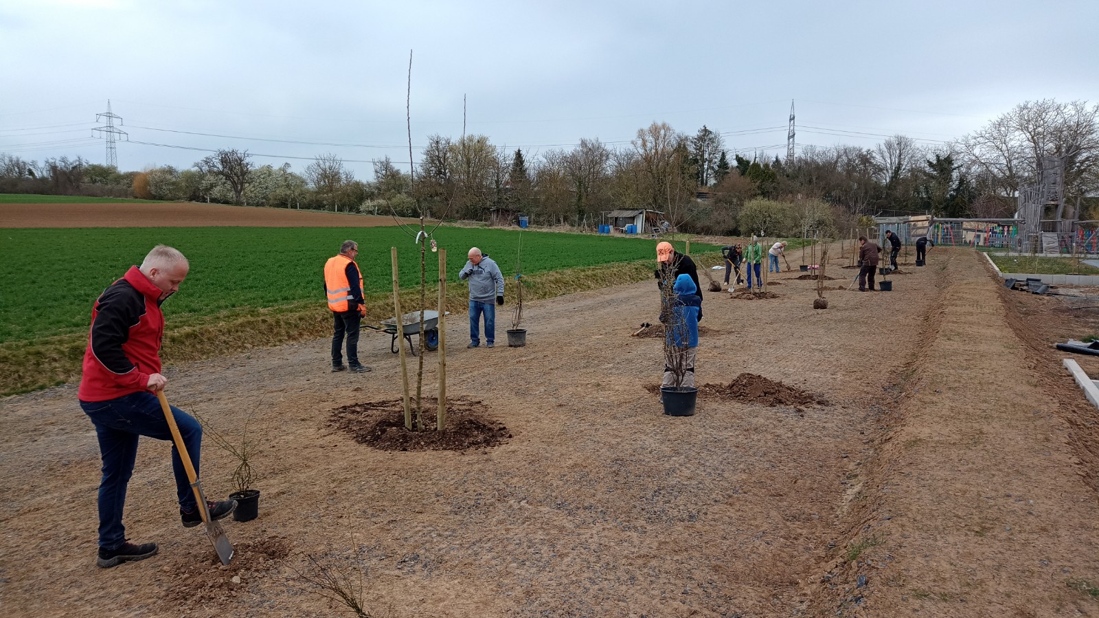 „Das war deutlich anstrengender als gedacht!“, mit diesem Tenor lässt sich die frühjährliche Pflanzaktion des Obereisesheimer Ortschaftsrates ziemlich treffend zusammenfassen. Grünbereichsleiter Günter Glaser hatte vorgeschlagen, die neue Flutmulde am westlichen Ortsrand mit Bäumen und Büschen zu bepflanzen. Dafür hatte er 5 Apfel-, 3 Kirsch- und 2 Birnbäume im Gepäck, die zuvor 5 Jahre lang in einer Gärtnerei gezogen worden waren. Schwarzer Holunder, Traubenholunder, Heckenrose, Schwarzdorn, Pfaffenhütchen, Kornelkirsche und Hartriegel – in Summe 35 Büsche und Sträucher - sollten zusätzlich in den Boden gebracht werden. In den Boden, weniger in die Erde. Denn beim Bau der Flutmulde wurde der Schotterunterbau des entfernten Weges großflächig und etwa 20 cm stark auf der gesamten Fläche verteilt. Bedeckt nur von einer wenige Zentimetern dicken Erdschicht, die die Pflanzarbeiten zu Beginn verführerisch leicht erscheinen ließ. Schon der erste Spatenstich allerdings sollte die Räte eines Besseren belehren. „Das ist ja, wie wenn man mit dem Spaten in Beton sticht!“ Und so war es auch. Eine Mordsschinderei sollte es werden, bis 45 Pflanzlöcher ca. 40 cm tief ausgehoben waren, weil erst nach etwa 30 cm einen Bodenschluss hergestellt werden konnte. Und einen Pickel hatte Günter Glaser vergessen. Doch was so ein gestandener Ortschaftsrat ist, denn schreckt eine Schotterschicht nicht. Nach zweieinhalb Stunden waren alle Bäume, Büsche und Sträucher ordentlich eingepflanzt und die Pflanzpfosten eingeschlagen. Angesichts der beinharten Pflanzarbeit war es kein Wunder, dass Weißwürstchen, Weißbier und Brezeln (Danke an die Bäckerei Eibauer) heuer ausgiebiger zugesprochen wurde als sonst üblich. Und wenn manch einen auch Tage später noch der Muskelkater plagen mag, der Gemeinschaftspflege im noch immer neuen Gremium hat diese Aktion in jedem Fall gutgetan.
