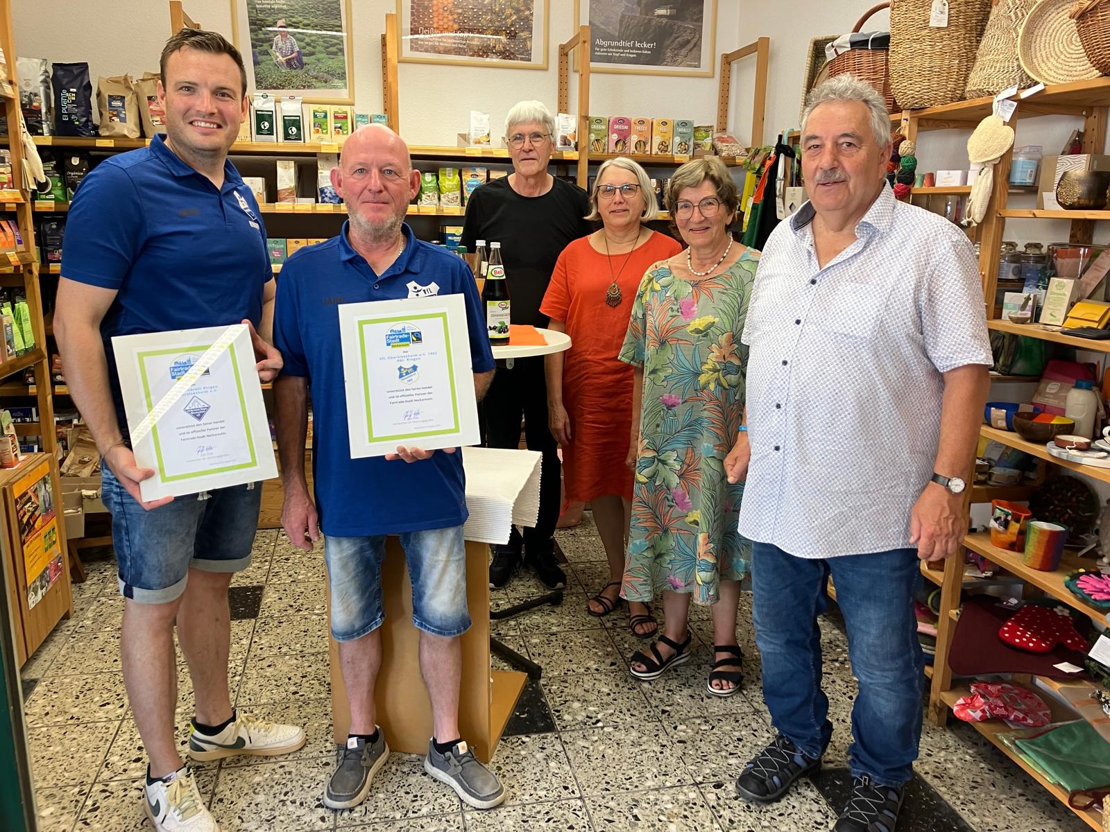 Die Stadt Neckarsulm darf sich seit 2021 „Fairtrade-Stadt“ nennen. Verschiedene Voraussetzungen müssen erfüllt sein, um diesen Titel tragen zu dürfen. Dazu gehört unter anderem auch, dass Kooperationspartner den Gedanken des fairen Handels mittragen. Als Partner konnten die Abteilung und der Förderverein Ringen des VfL Obereisesheim neu gewonnen werden. Bei einem kleinen Zusammentreffen der Ringer und der Steuerungsgruppe der Stadt Neckarsulm im Weltladen Obereisesheim wurden jetzt die Urkunden überreicht. „Im Mittelpunkt unserer Aktion muss weiter stehen, dass wir die Menschen für den Gedanken des fairen Handels sensibilisieren“, verdeutlichte der Sprecher der Steuerungsgruppe, Joachim Eble. „Dafür gebührt den Ringern beim VfL Obereisesheim Dank und Anerkennung.“ VfL-Ringerchef Michael Schönig und der 1. Vorsitzende des Fördervereins, Jan Seufer, nahmen die Urkunden mit sichtbarer Freude entgegen.
