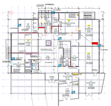 Durch die geplante Nutzung durch die Katholische Fachschule werden verschiedene bauliche Anpassungen erforderlich. Hierzu zählen die Sanierung der Sanitäranlagen, der Rückbau der bestehenden Lehrküchen sowie der naturwissenschaftlichen Fachräume. Zudem ist zur Herstellung eines zweiten baulichen Rettungsweges die Errichtung eines zusätzlichen Fluchttreppenhauses notwendig. Weiterhin sind Dachabdichtungsarbeiten sowie ergänzende Elektroinstallationsarbeiten auszuführen, die dem Stand der Technik entsprechen.