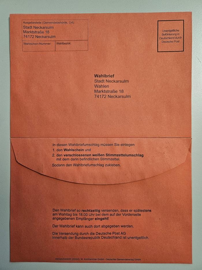 Für die Teilnahme an der Wahl per Briefwahl ins Ausland beachten Sie, dass der Wahlbrief ausreichend frankiert wird. Leider können wir auch hier voraussichtlich ab dem 26. Januar mit dem Versand der Briefwahlunterlagen beginnen. Dennoch bitten wir Sie Ihre Briefwahlunterlagen schnellstmöglich zu beantragen und die zugestellten Wahlunterlagen anschließend auch schnellstmöglich zurückzusendet, damit diese spätestens am Wahlsonntag bis 18:00 Uhr bei der Stadt Neckarsulm, Rathaus, Marktstraße 18, 74172 Neckarsulm vorliegen. Wir empfehlen, Wahlbriefe aus dem Ausland per Luftpost oder Express zu versenden. Den Luftpostaufkleber (Priority/Prioritaire) finden Sie im Internet.