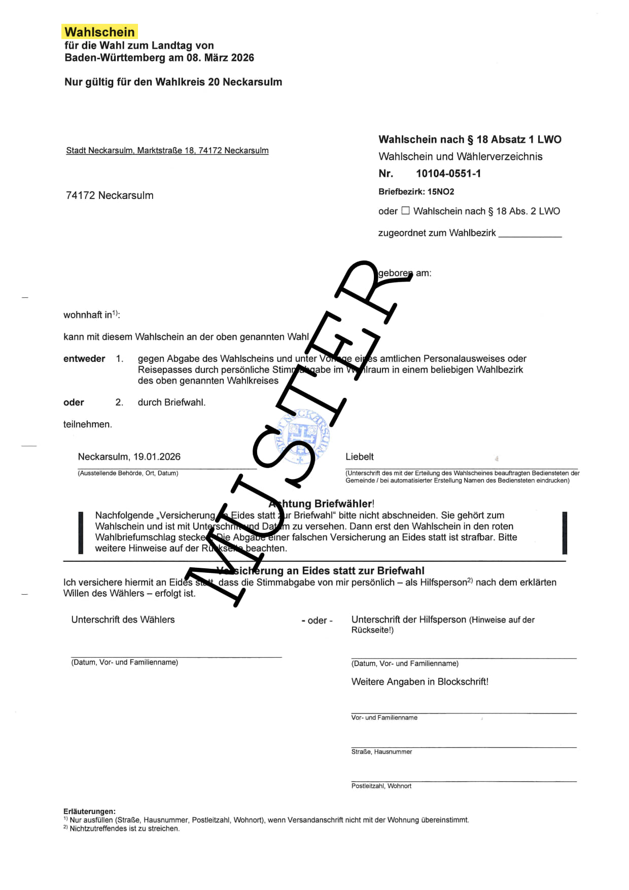 - schriftlich: Auf der Rückseite Ihrer Wahlbenachrichtigung befindet sich bereits ein Vordruck, den Sie ausgefüllt zurücksenden können. Die Schriftform gilt auch durch Fax oder E-Mail (wahlen@neckarsulm.de unter vollständige Angabe Ihres Vor- und Familiennamens, Ihres Geburtsdatums und die aktuelle Adresse) als gewahrt.