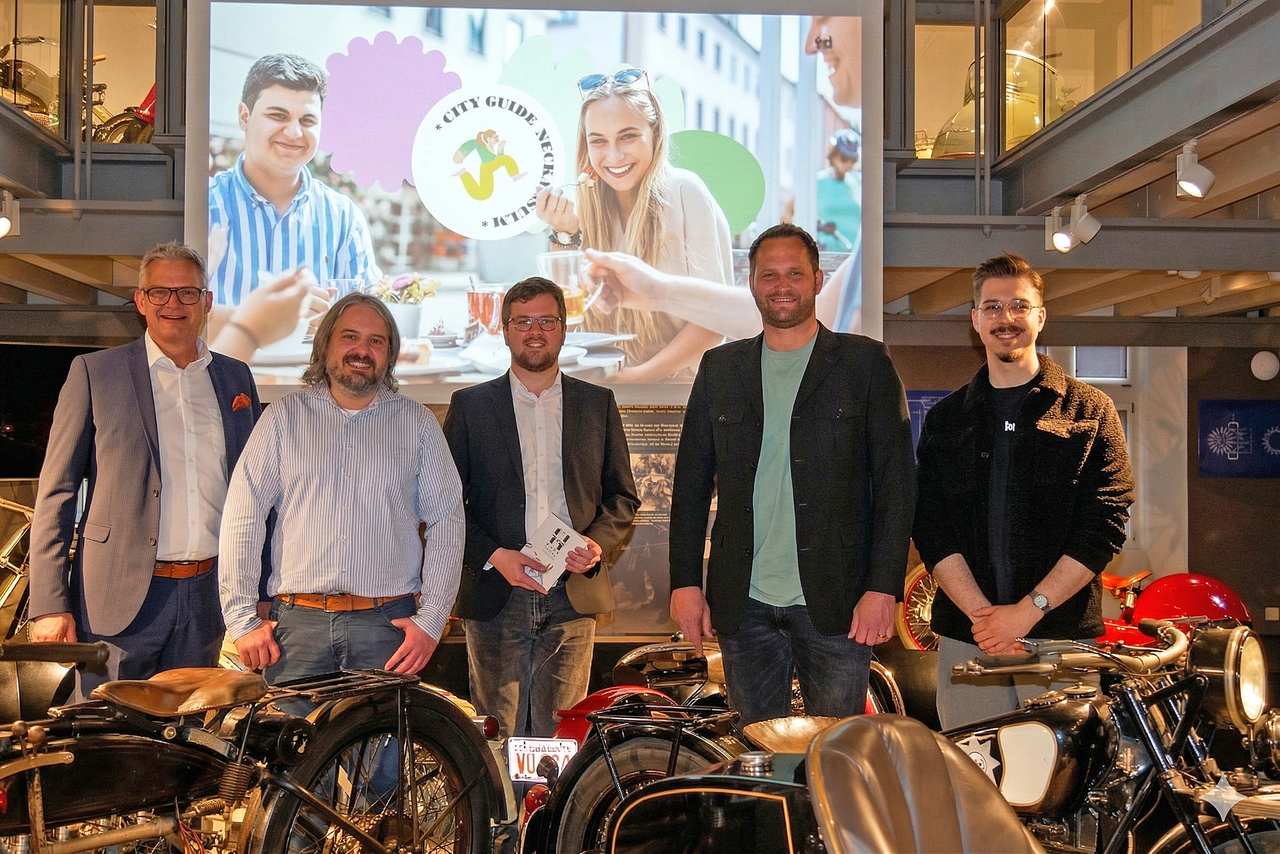 Der Gewerbeverein Neckarsulm und das städtische Citymanagement bündeln ihre Kräfte und präsentieren eine neue, gemeinsame Internet-Plattform für die Innenstadt. Mit dem digitalen Cityguide unter www.neckarsulmerleben.de steht Bürgerinnen und Bürgern sowie Besucherinnen und Besuchern ab sofort ein moderner und umfassender Überblick über das vielfältige Angebot in Neckarsulm zur Verfügung. Die neue Homepage ersetzt die bisherige Website des Gewerbevereins. Oberbürgermeister Steffen Hertwig, Citymanager Daniel Bürkle und der Vorsitzende des Gewerbevereins, Nicolas Härdtner, stellten den neuen Webauftritt bei einem Pressetermin am Freitag (10.04.) im Deutschen Motorradmuseum vor.