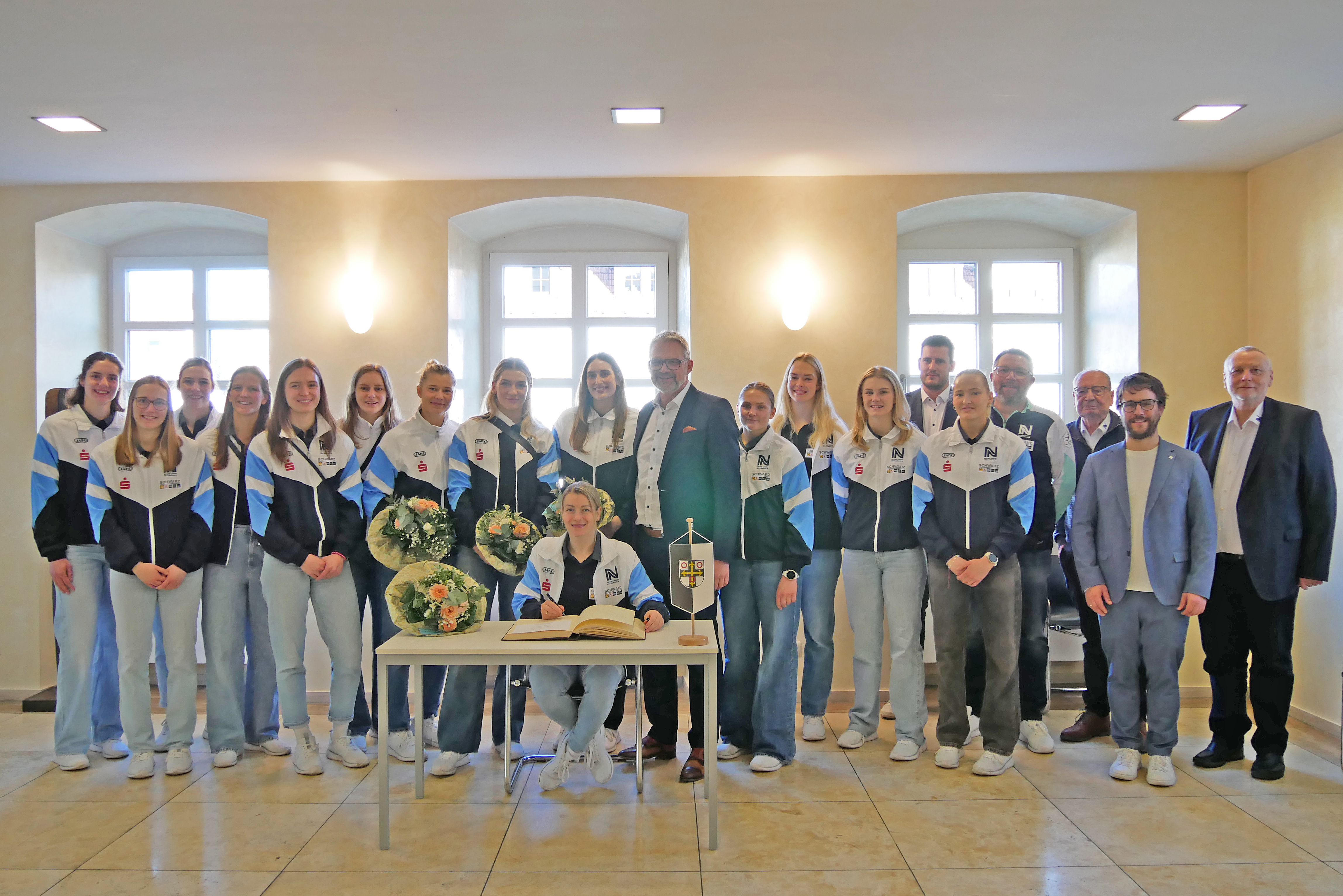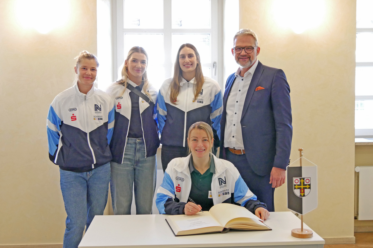 Als „einige der besten Handballerinnen der Welt“ begrüßte Oberbürgermeister Steffen Hertwig die Kapitänin der Deutschen Frauenhandball-Nationalmannschaft, Antje Döll, sowie die Nationalspielerinnen Lena Ivancok (Österreich), Kamila Kordovská (Tschechien) und Paulina Uscinowicz (Polen) im Rathaus-Foyer. Dort trugen sich die Spielerinnen in das Gästebuch der Stadt ein. „Damit halten wir die WM-Teilnahme als besonderes Ereignis in der Stadtgeschichte fest“, erklärte Steffen Hertwig. An dem Empfang nahmen auch die SUN-Bundesligamannschaft der Frauen, Vorstandsvorsitzender Rolf Härdtner, Vorstandsmitglied Bernd Dollmann sowie Betreuer, Trainer und weitere Vereinsvertreter teil.